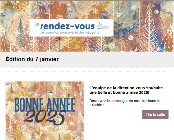 Le rendez-vous du CCSMTL est un outil de communication organisationnel officiel, qui diffuse de l’information utile et pertinente, qu’il est de notre devoir de connaître. Tous les membres du personnel reçoivent donc ce journal interne par courriel chaque semaine, sans possibilité de désabonnement.